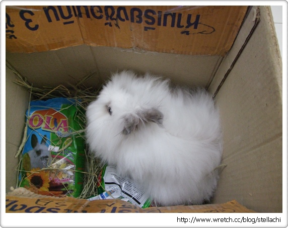 上星期四晚,正當Chi上街溜YY及GiGi的時候,在家樓下的寵物店大門外發現了一個紙皮箱,內有一隻漂亮可愛的白色安哥拉兔,以及兩袋兔食糧。如此大發現,Chi當然第一時間打電話回家跟愛妻商量。雖然我們家確定是養不了的,但考慮到現有飼養小兔的妹妹可能會願意收留這頭兔子,便先把她帶回家中。