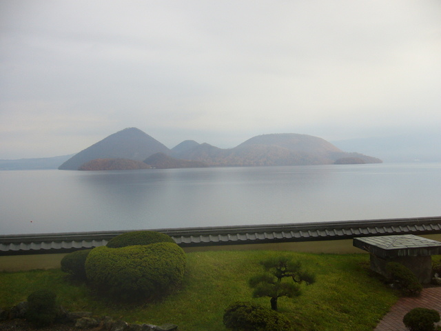 旅程的第二天,我們到天黑了才下榻洞爺湖的湖畔亭溫泉酒店,到第三天早上一醒來,看到窗外的洞爺湖,很是驚喜! 雖然湖水的顏色並不是特別美麗,但這湖就是有一種說不出的寧靜美。
